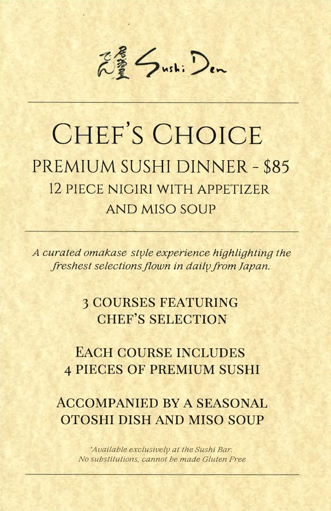 Chef’s Table takes place in Sushi Den’s private room, with your Omakase Chef.
